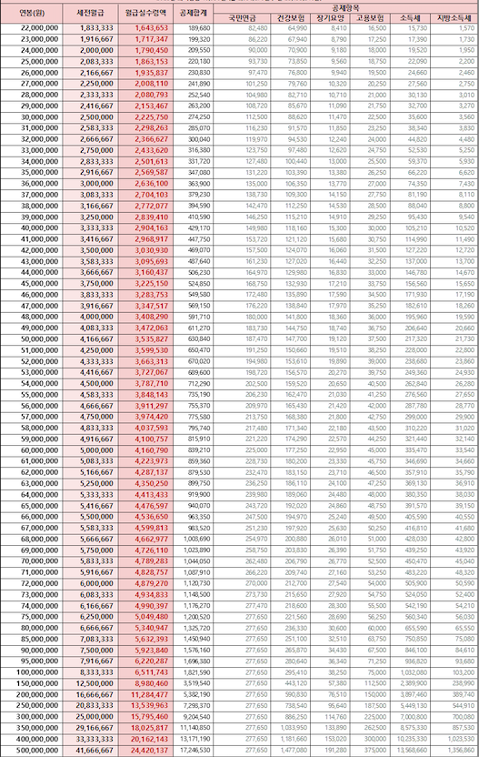 구체적인 연봉 실 수령액은 아래의 표를 참고해주세요